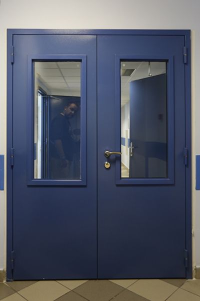 Противопожарная алюминиевая дверь синего цвета в Чехове