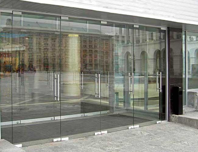 Противопожарная безрамная дверь со стеклом в торговый центр в Чехове