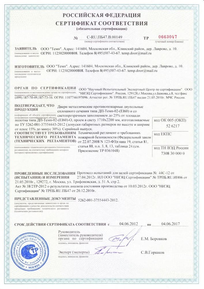 Двери металлические противопожарные двупольные сплошного сечения типа ДП-Темп-02-(EI60) и со светлопрозрачным заполнением до 25% от площади полотна типа ДП-Темп-02-(EI60)-О, проем к свету 1710х2200 мм, изготовляемые по ТУ 5262-001-37554443-2012 (допуски габаритных размеров по высоте и ширине от +15% до -30%).